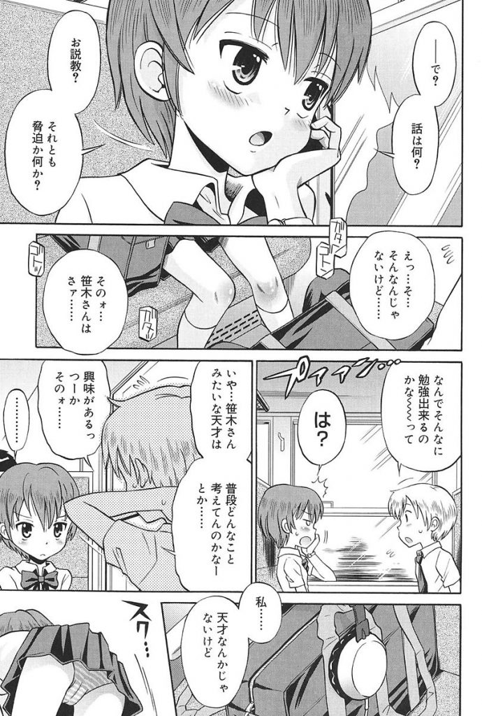 頭が良いとチヤホヤされてた男子が有名な私立中学に入学して井の中の蛙だと知り限界を感じてる時に通学電車の中で自慰していた同級生の天才JCに出会う!興味が出た男子は電車の中でJCと会うとJCは手コキしてきてオナニーをする!それからいつも同じ車両で危ない事をしていく二人!車内トイレでJCが誘い勉強は忘れて初体験すると成績が上がる!