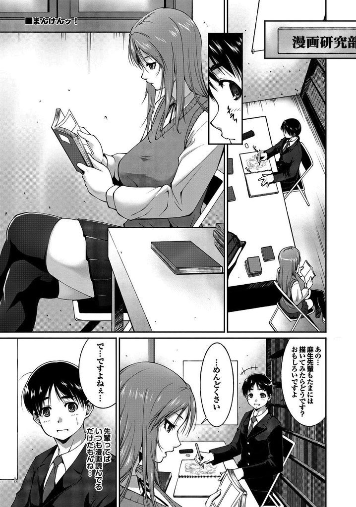 いつも漫画を読んでる漫研部の爆乳先輩が後輩男子の描いてる絵が自分に似てたので覗きこんでみてたら胸に不自然さを感じたのでおっぱいモデルをしてあげる!黒ブラ姿になりJラインの乳房を披露すると勃起してるのに気づき辛さうなんでフェラしてあげて乳圧で包み込んで乳内射精させる!続きをさせたあげて立ちバックで牝顔になり中出しさせて衝撃告白!