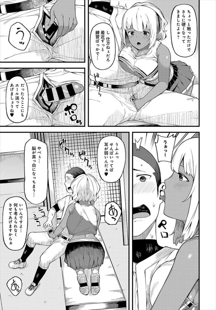 【エロ漫画】落ち込む野球部キャプテンを励ます褐色巨乳チアガールの後輩JKがフェラからのM字開脚騎乗位でエールを送る!