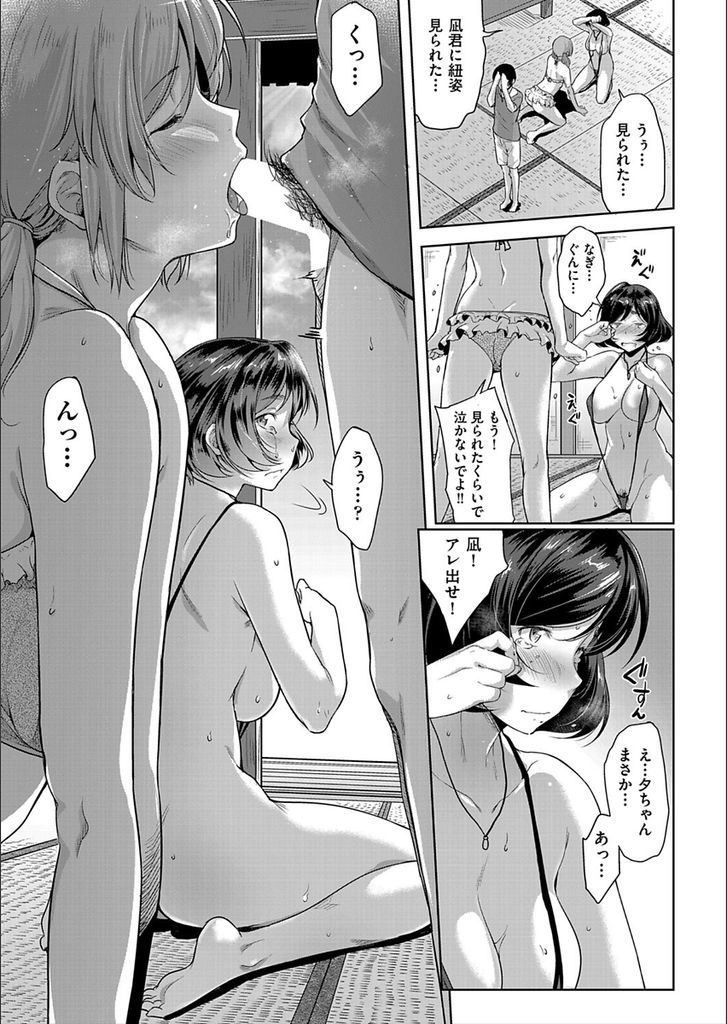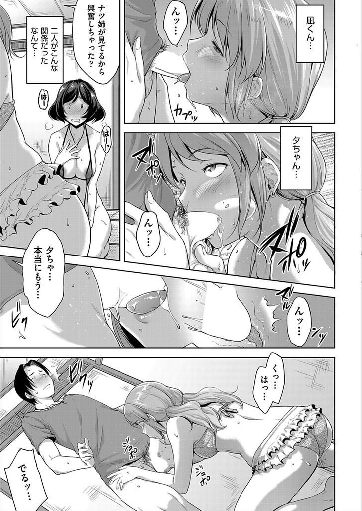 【エロ漫画】紐水着姿の豊満ボディの姉が片思い中の隣人と妹のオーラルプレイを見せつけられ発情しオマンコくぱぁで挿入懇願!
