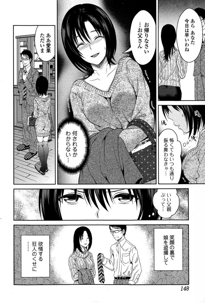 - >【エロ漫画】彼氏とのセックスを盗撮した動画で自慰する父親を見たJK娘が隠しカメラを探すも口封じに親子近親レイプされる!