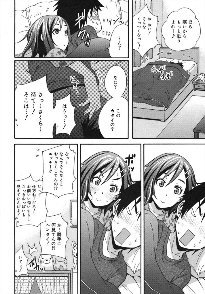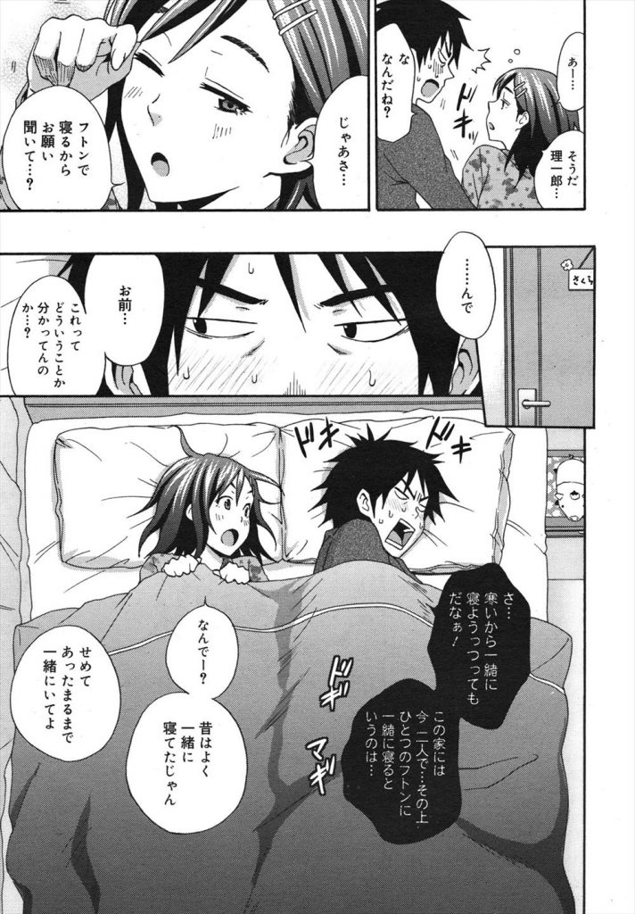 【エロ漫画】両親が旅行中で幼馴染に面倒を見てもらうマイペースなJKが一緒の布団で寝て貰い勃起した彼に乙女の純潔を授ける!