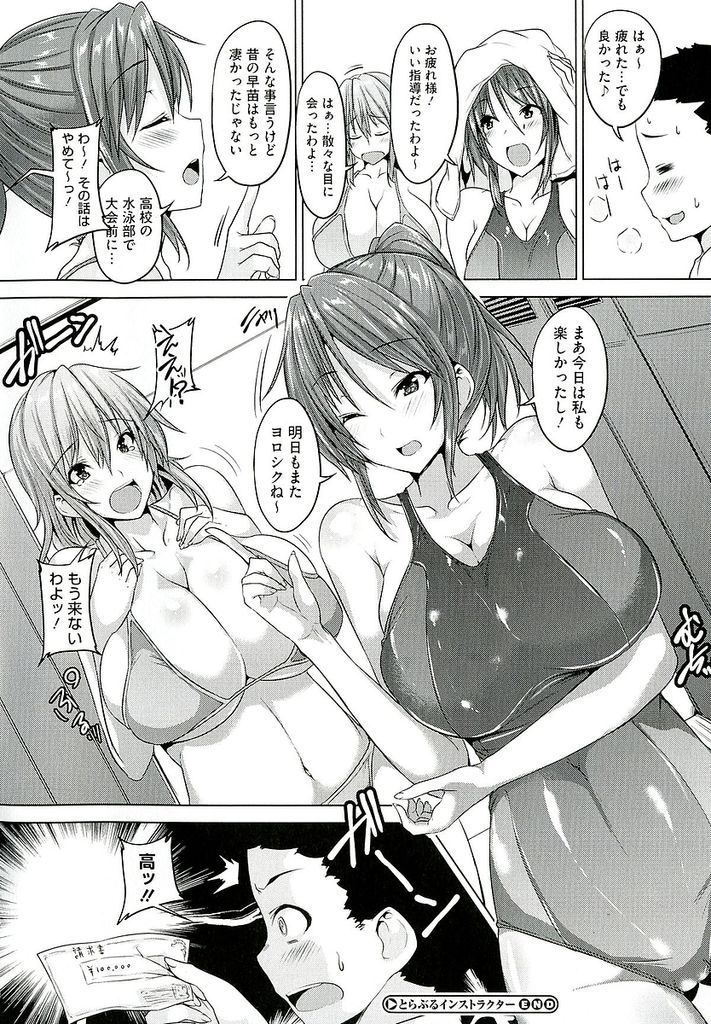 - >【エロ漫画】水泳教室に来た男子の巨根を即尺するエロボディの女インストラクターが陥没乳首の爆乳新妻も巻き込み3P乱交!