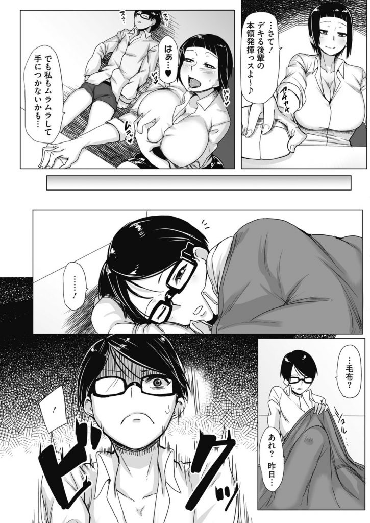 - >【エロ漫画】残業を頑張る先輩にエロ自撮りで誘惑する後輩のエロい爆乳OLが溜め込んだ性欲処理を献身的にご奉仕えっち!