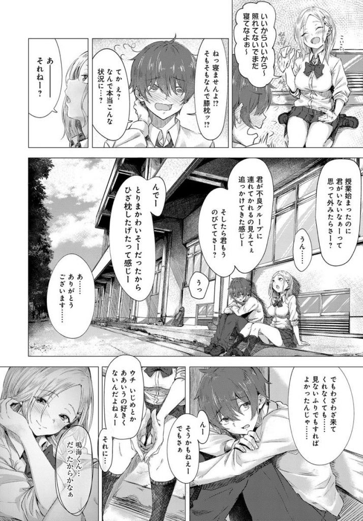 - >【エロ漫画】顔がタイプの童貞男子を膝枕する白ギャルが筆おろしで部室に連れ込みリードしながら抜かずの連続セックス!