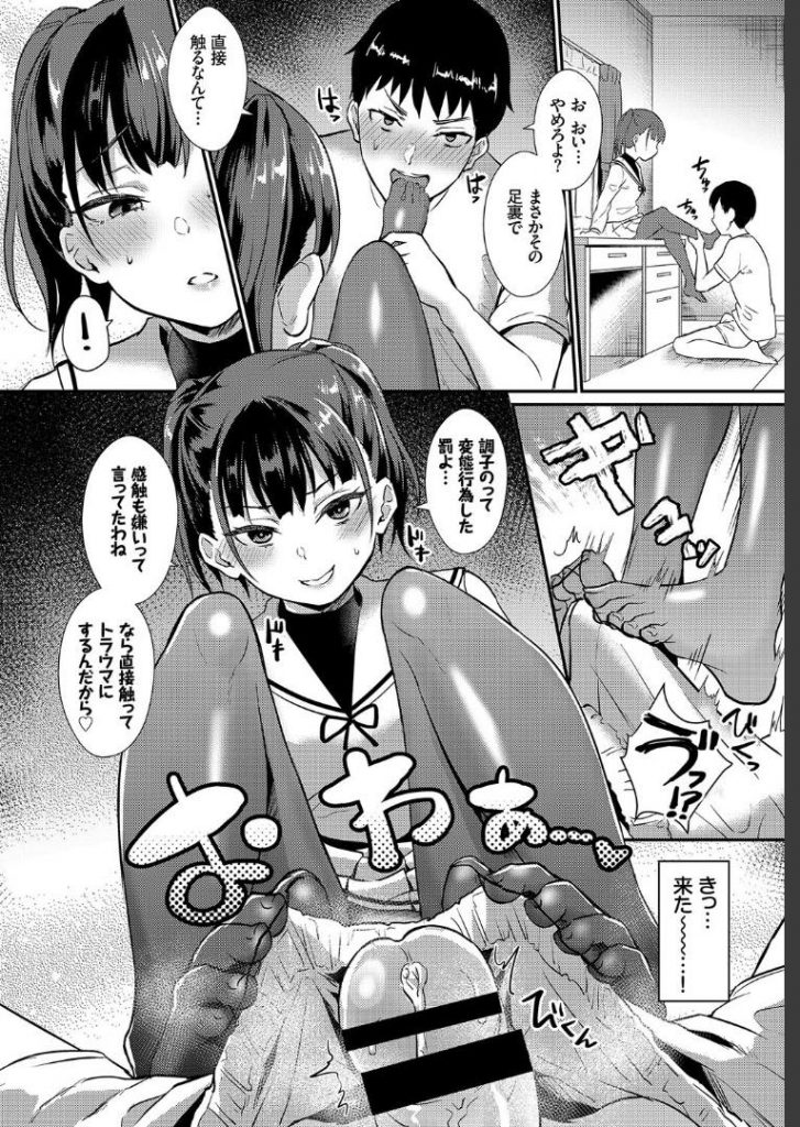 - >【エロ漫画】ウザイ幼馴染の弱点が黒ストだと知りトラウマにしようと足責めするJKが実は嘘を付いてた彼に騙されイチャハメ!