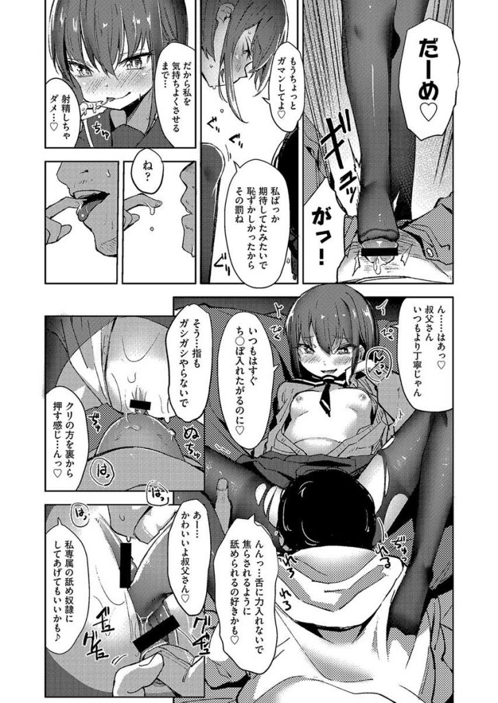 - >【エロ漫画】彼氏が出来た母親に邪魔者扱いされ寂しさを紛らわす為に叔父と肉体関係を持つJCがS責めで中年男を翻弄する!