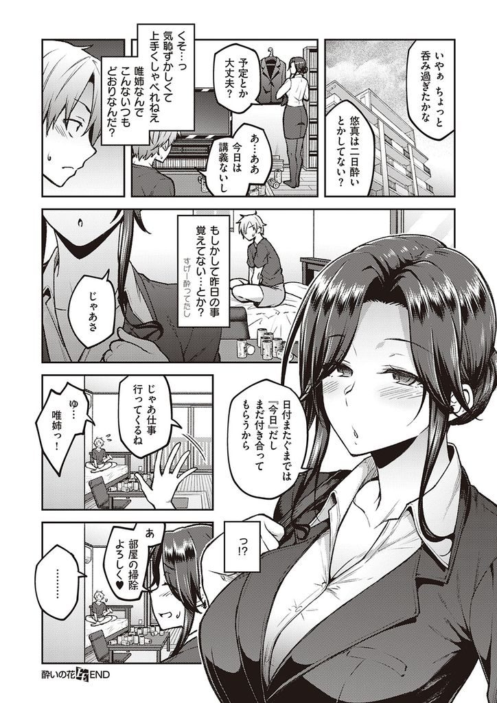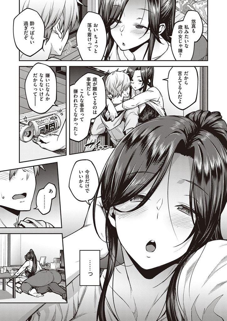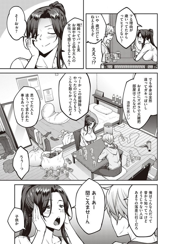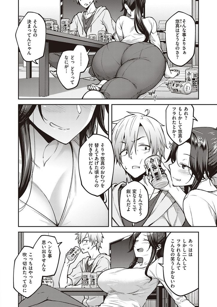 - >【エロ漫画】外見と中身の落差に引かれ失恋した爆乳お姉さんが年下男に愚痴り酔った勢いで昔した結婚の約束を迫りSEX!