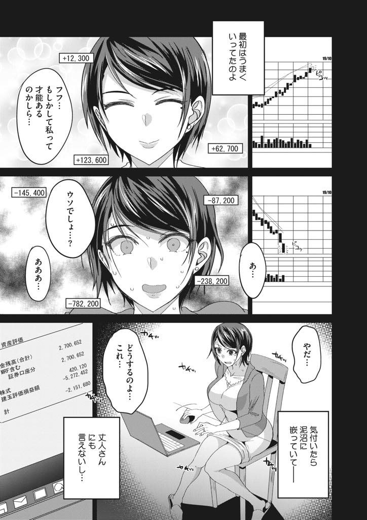 - >【エロ漫画】投資に失敗してトレーダーの義弟に救いを求め肉体取引を要求される兄嫁が久々の生チンポに堕ちて泥沼不倫!