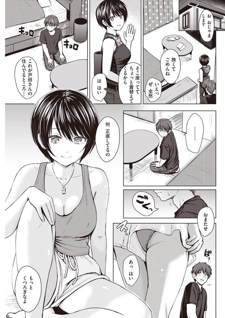 - >【エロ漫画】年下男に下ネタトークで好きなAV女優を聞く小悪魔娘がAVを一緒に見ようと誘い若い絶倫マラを味わい尽くす!