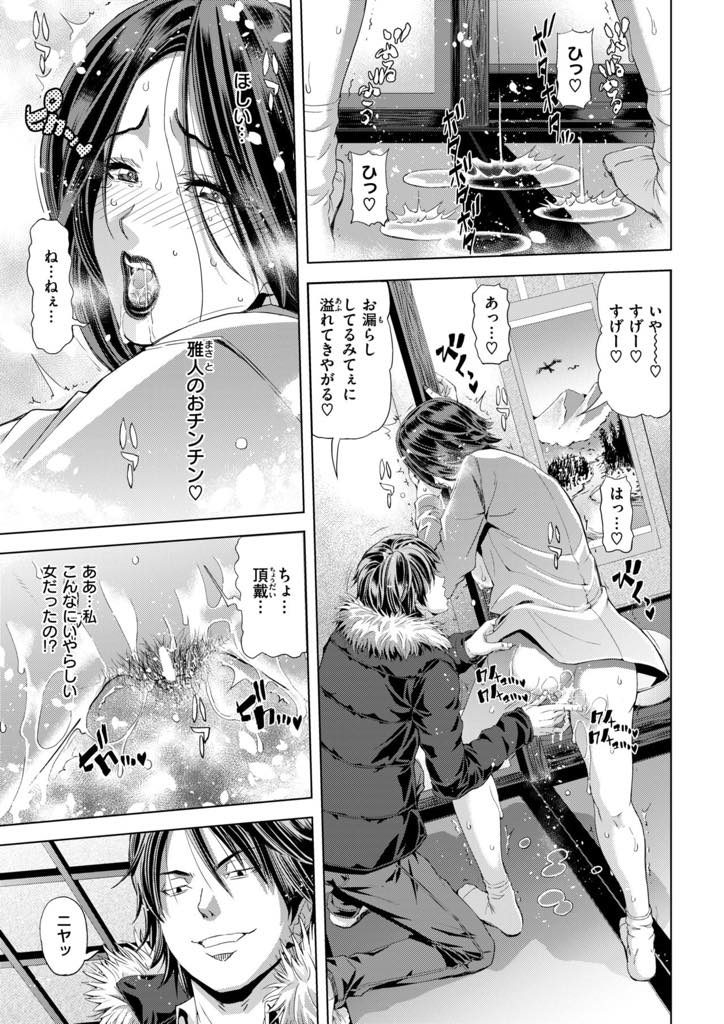 - >【エロ漫画】旦那に嘘を付き不倫旅行に来た熟妻が若い男に捨てられたくない一心で混浴温泉の人前で激エロ羞恥セックス!