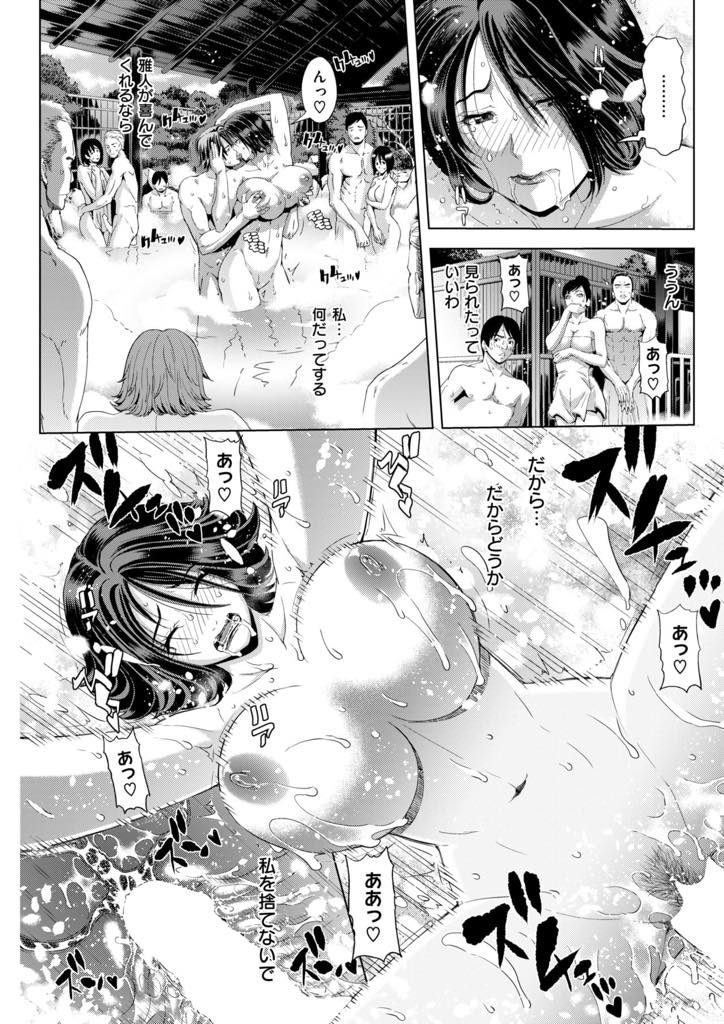 【エロ漫画】旦那に嘘を付き不倫旅行に来た熟妻が若い男に捨てられたくない一心で混浴温泉の人前で激エロ羞恥セックス!