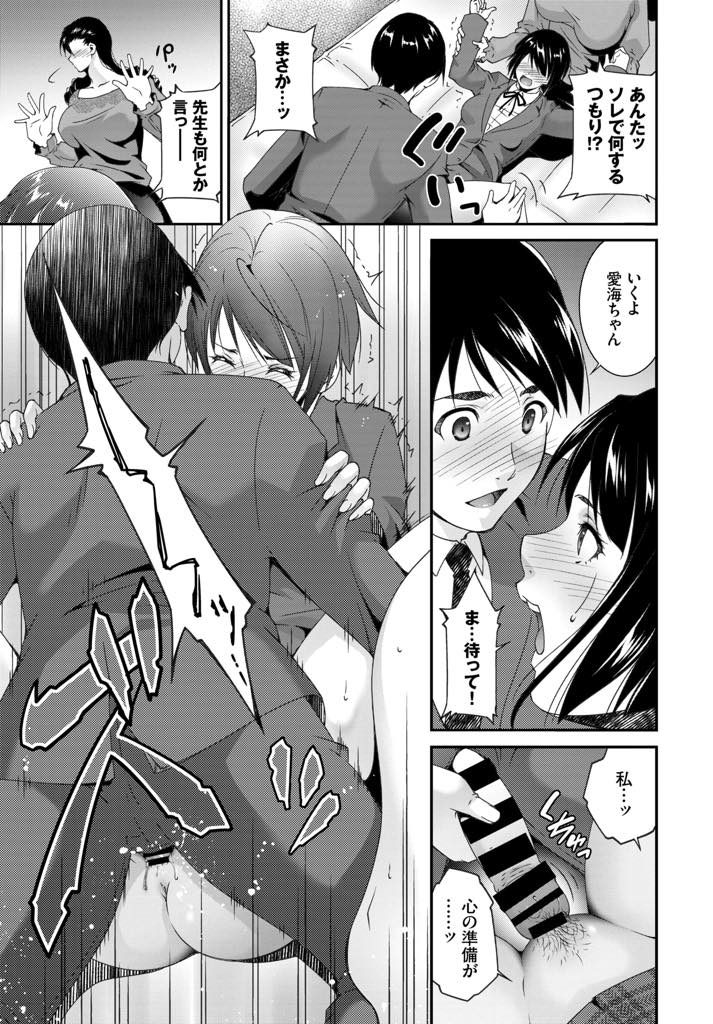 - >【エロ漫画】相思相愛なのに上手くいかない幼馴染同級生の仲を取り持つ女教師が荒療治で二人に初体験させるとお礼の3P!