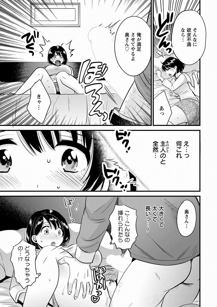 | 【2話】【エロ漫画】配達員にエッチを迫る絶倫人妻が町内会長に酒を飲まされ朦朧とする中旦那と勘違いして浮気中出しセックス! |