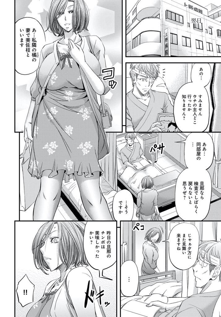 - >【エロ漫画】入院中の夫とHしてるのを相部屋の患者に見られ寝取られる人妻が目が見えない旦那とハメながらアナル不倫!