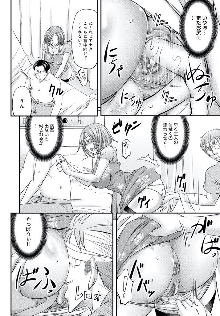 【エロ漫画】入院中の夫と病室でセックスしてるのを寝ているフリしていた相部屋の患者に見つかり脅迫されて性欲処理を強要される淫乱人妻!アナル処女を奪われそうになり、スリルで興奮する変態女だとバレてしまう!目の見えない旦那とマンコでハメながら浮気チンポをケツ穴で受け入れて二穴挿入の肛門不倫!快楽の虜になりチンポ狂いになった人妻はネトラレ堕ち!