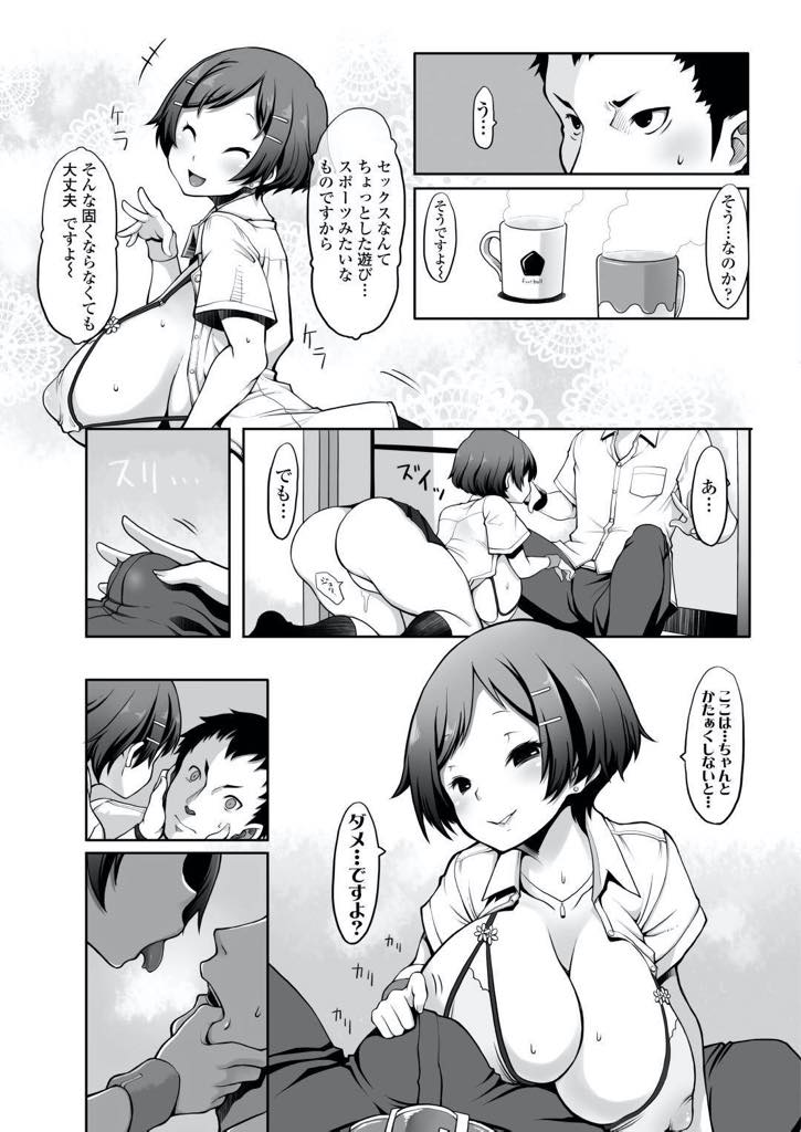 - >【エロ漫画】昔ジュニアサッカークラブで一緒だったボーイッシュな女の子が高校生になって爆乳JKになって遊びに来た!再開した先輩の家でエロ下着を披露して興奮したチンポで責めの筆下ろし連続中出しセックス