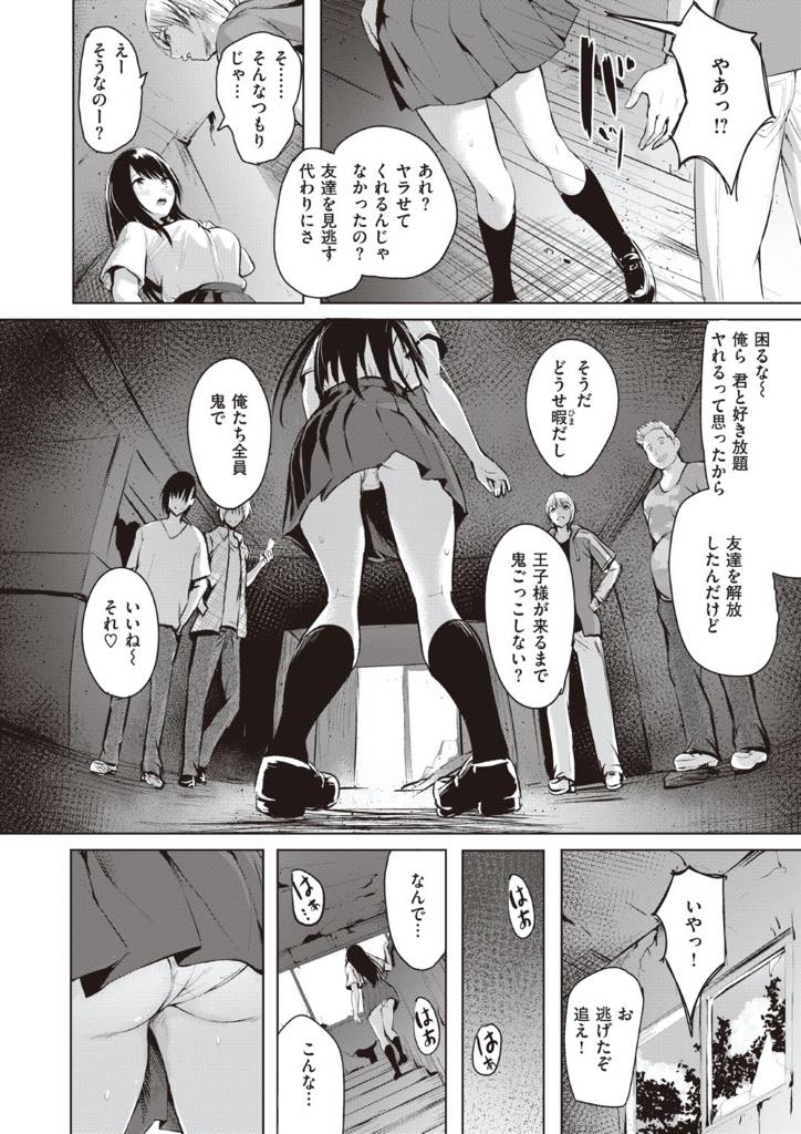 【エロ漫画】久しぶりに再開したちょっとヤンチャな幼馴染のことを優しい男だと信じる黒髪ロングの正確100点美少女JKは、その幼馴染に恨みを持つ不良グループに拉致られ無残にも男達の餌食となり輪姦されてゆく