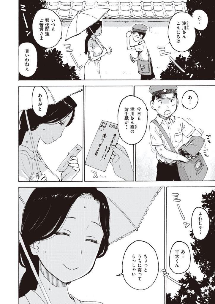 - >【エロ漫画】大きくなったらエッチする約束をした年下の幼馴染に偶然再会した巨乳人妻は昔のように胸の谷間に麦茶溜めてを飲ませ旦那がいないことを仄めかせ約束を果たして浮気中出しセックス