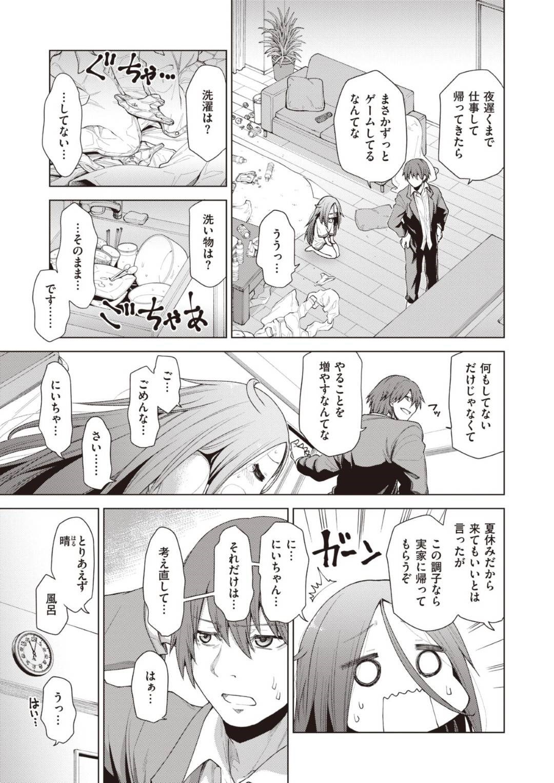 - >【エロ漫画】一人暮らししている兄の家に泊まりに来ている妹は、実家に帰らされないように兄を全裸で誘惑してフェラして顔射される!