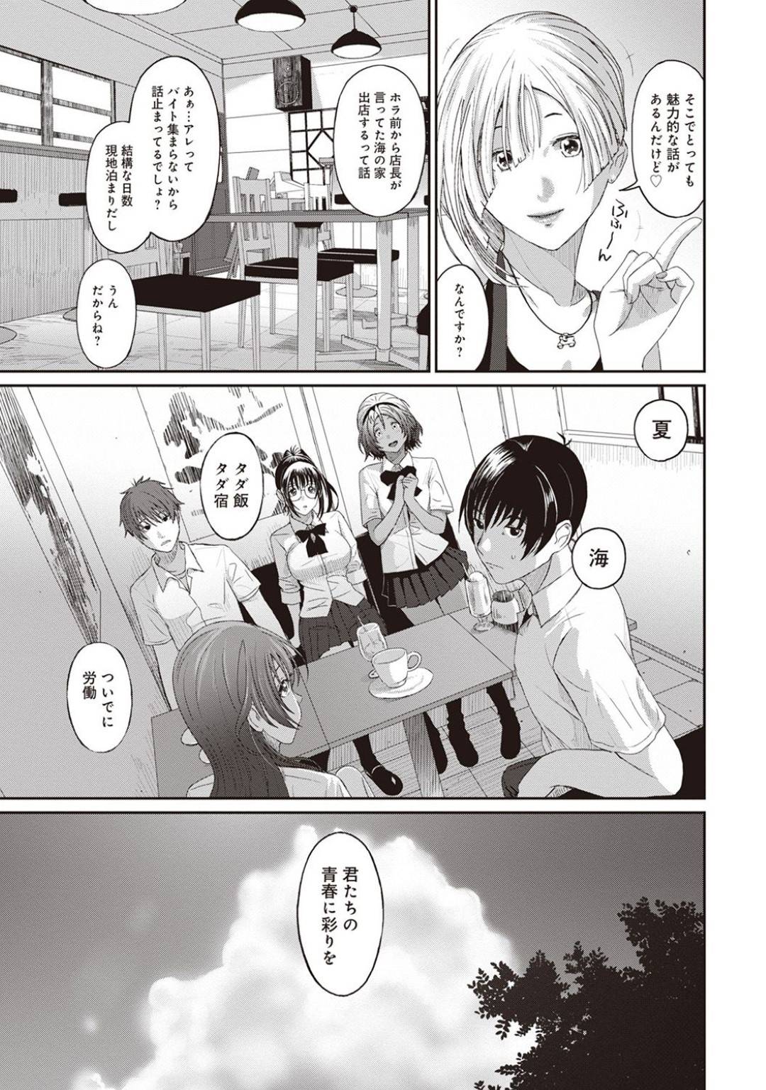 | 【9話】【エロ漫画】海の家でのバイトのため、当面の宿となる民宿へとやって来た一行。しかし、道中で車酔いになってしまった小衣は到着するやいなや、ひとりで横になって休むことに。その後、日も暮れて目が覚めた小衣は相川と散歩にでかけるのだが、どこからともなく女の喘ぎ声が聞こえてくる。暗がりの中、ふたりして音のする方へ目を凝らししてみると、そこには野外エッチに励む亜衣がいて!? |