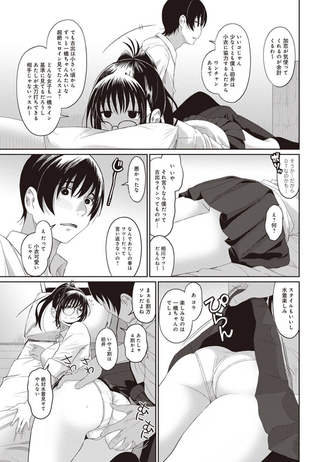 | 【13話】【エロ漫画】小衣は、友森の好意に満更でもないようだが、相川のことも憎からず思っている様子。それに気づいた一橋がついに行動を起こす! |