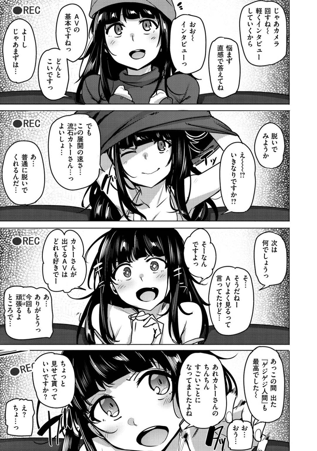 【エロ漫画】ナンパAVに出演してくれる女の子を探していると、地面に這いつくばってパンツ丸出しでカメラ撮る変わり者が!声かけると、AVに出演したい!と食い気味に食いついてきて撮影場所へ直行!!AVを研究している文香という女は、カメラマンの指示待ちなしにコツを掴んだフェラから生挿入セックスで男優を翻弄するw