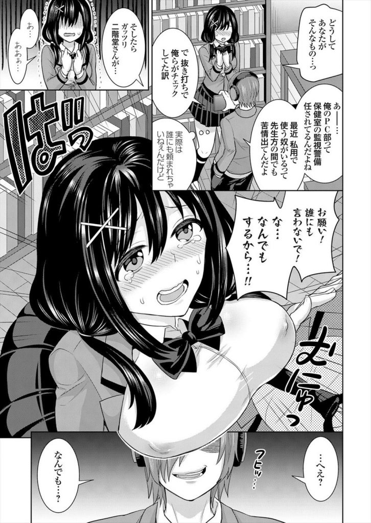 【エロ漫画】保健室の遠隔監視をするPC研究会の男がマジメJKのセックスを盗撮しNPNBで屋内露出させハメドリ!