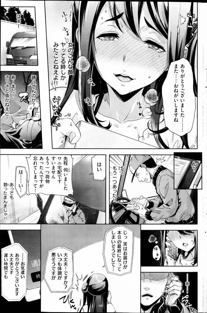 【エロ漫画】バイブを突っ込みノーブラで浮き上がった乳首で愛液の匂いをさせ宅配便の応対をする痴女人妻!