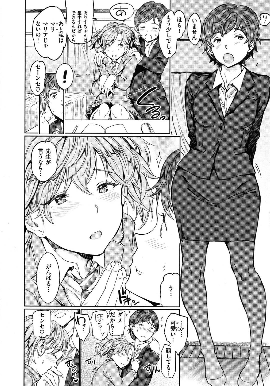 | 【3話】【エロ漫画】エッチな事に興味津々な教え子に目隠しさせられた挙げ句、身体を椅子に拘束されてしまった美人家庭教師。抵抗できない彼女は教え子にされるがままに手マンされたり、乳首を責められたりし、クンニさせられたりとレズプレイをする羽目になる。 |