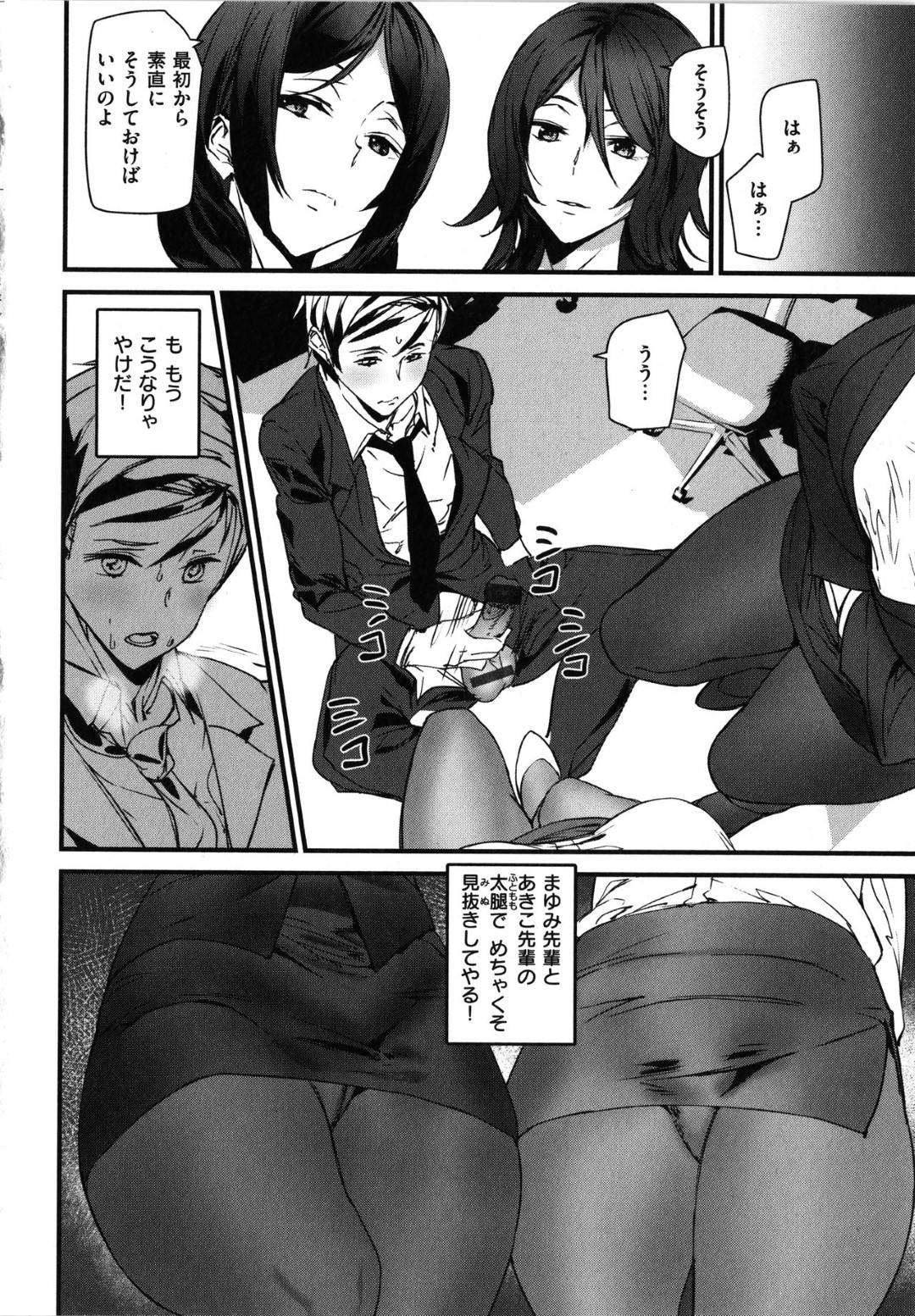- >【エロ漫画】二人の先輩OLにエッチな事をさせられてしまう後輩のM男。気の弱い彼に二人は顔面騎乗位したり、足コキしたりしては強制射精させる。