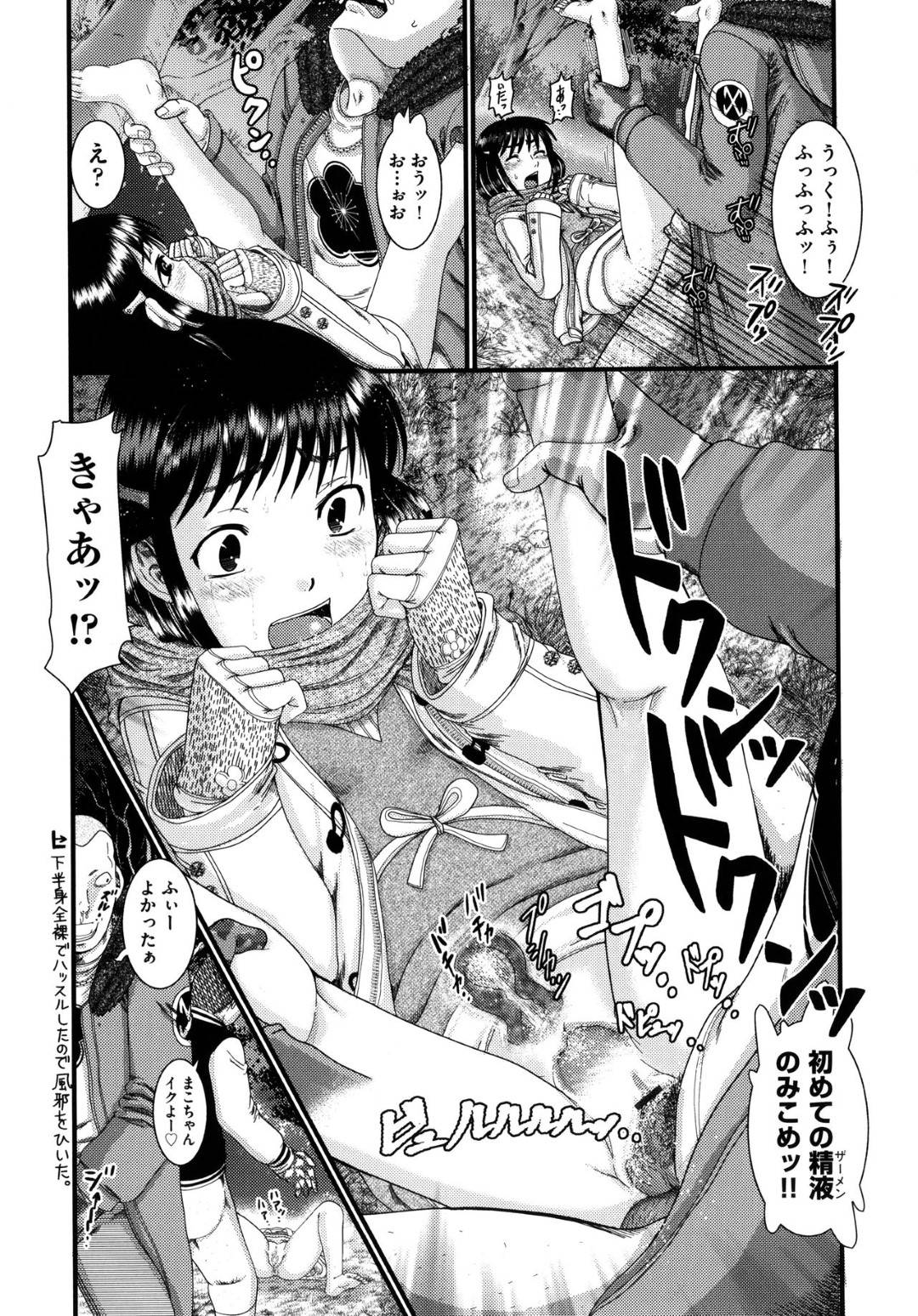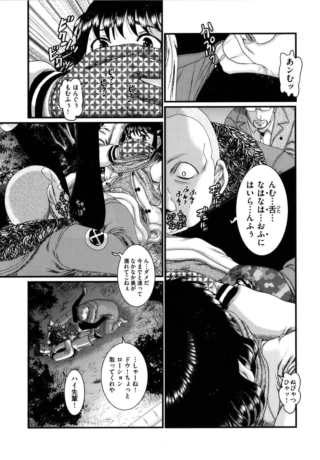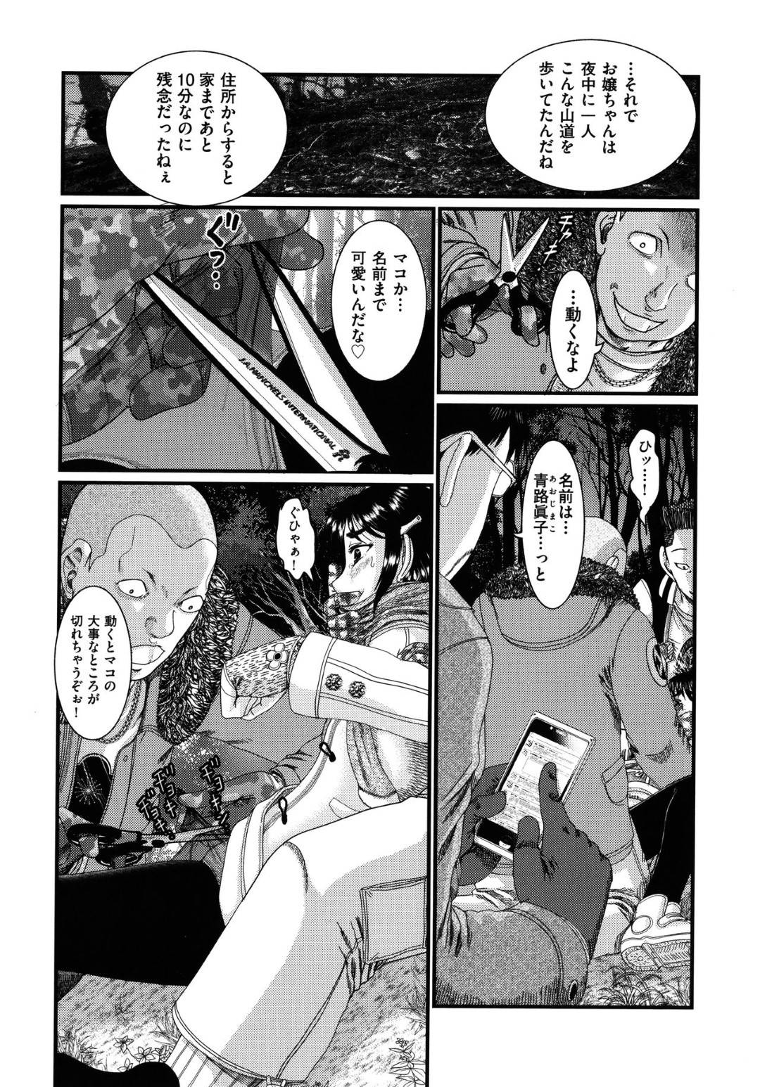 - >【エロ漫画】夜の森中で男たちに拉致され拘束状態の小学6年生女子。マンコのニオイを嗅がれながら徐々に迫ってくる手によって犯され、生ちんぽで青姦レイプで輪姦されてしまう!