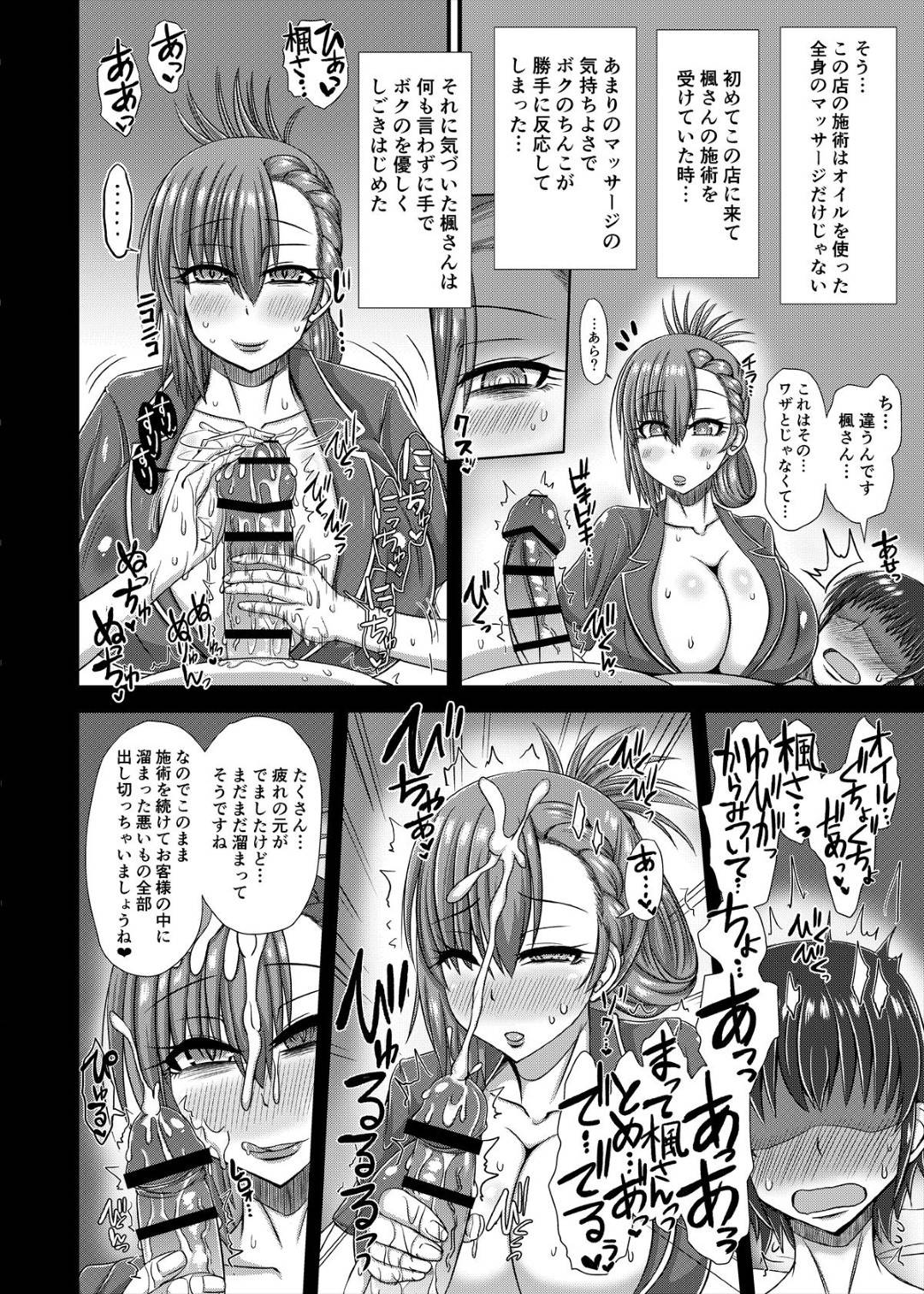 - >【エロ漫画】常連の客にエッチなマッサージを施す爆乳エステティシャンの楓…淫乱な彼女は彼を手コキで射精させた後、我慢できずに自らおまんこを開いて中出しセックスをおねだりする!