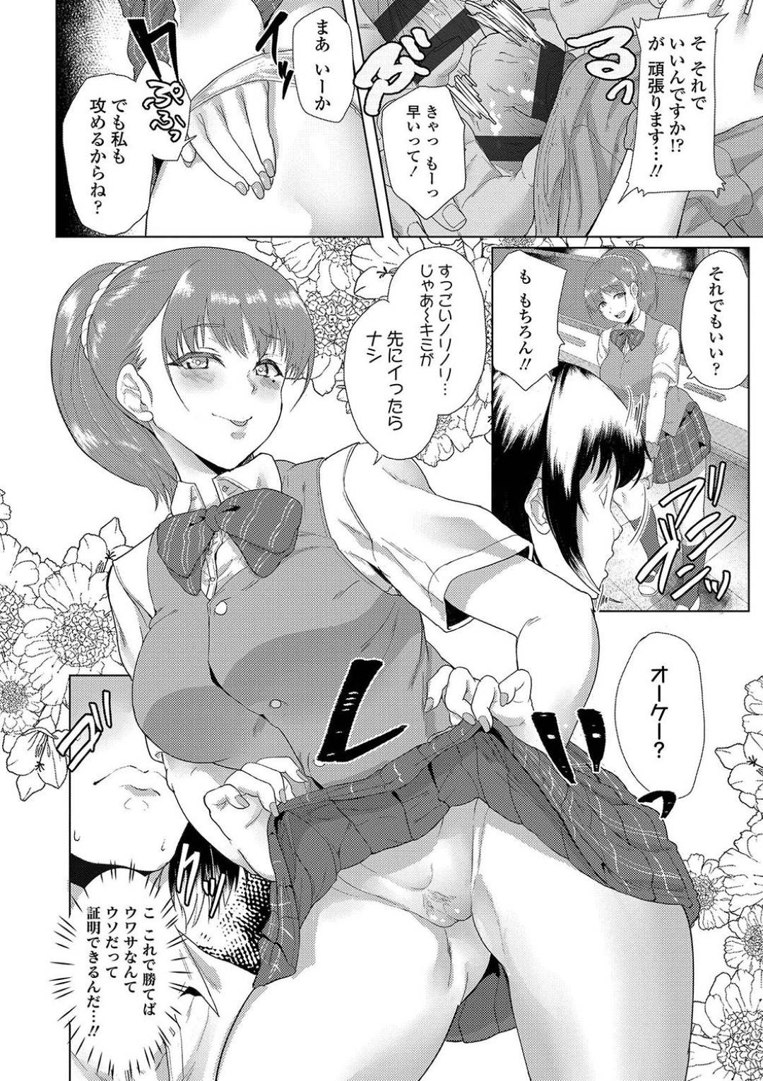 【エロ漫画】清楚系ビッチな同級生に空き教室へと呼び出された主人公。彼が巨根と噂を聞いた彼女は彼のチンポに興味津々のようで、半強引に手コキで射精させた後、騎乗位で童貞を奪う。