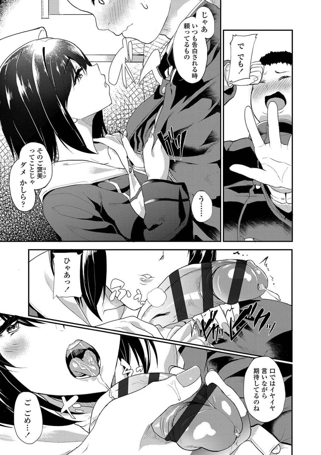 【エロ漫画】清楚系ビッチな同級生に空き教室へと呼び出された主人公。彼が巨根と噂を聞いた彼女は彼のチンポに興味津々のようで、半強引に手コキで射精させた後、騎乗位で童貞を奪う。