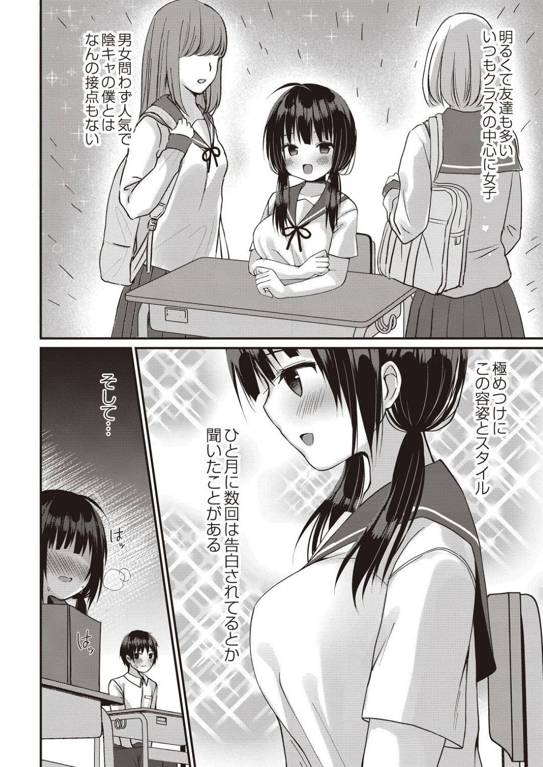 【エロ漫画】清楚系ビッチな同級生に空き教室へと呼び出された主人公。彼が巨根と噂を聞いた彼女は彼のチンポに興味津々のようで、半強引に手コキで射精させた後、騎乗位で童貞を奪う。