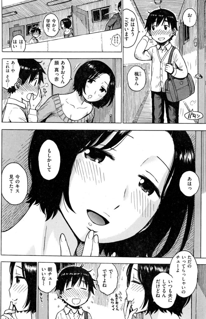 【エロ漫画】お隣の美人妻に玄関先で痴女られ忘れ物で戻った旦那とドア越しチューしてる最中にナカ出しする学生!