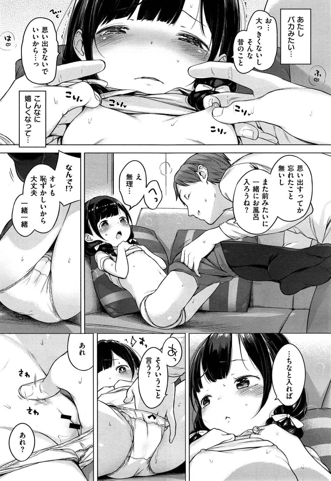 - >【エロ漫画】ひょんな事がきっかけで幼馴染とエッチな展開になってしまった小柄な貧乳娘…彼女は彼に身体を委ねて手マンや乳首責めなどを受けた後、正常位で挿入されてイチャラブセックスへと発展する!