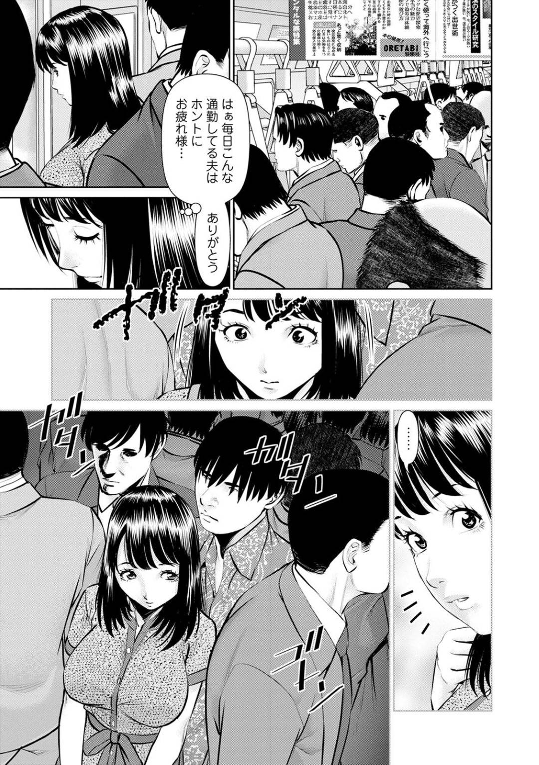 - >【エロ漫画】満員電車で男たちから痴漢を受ける巨乳人妻…抵抗できない状況で彼女は手マンや乳首責めなどをされた挙げ句、そのまま立ちバックで生ハメセックスまでさせられる!