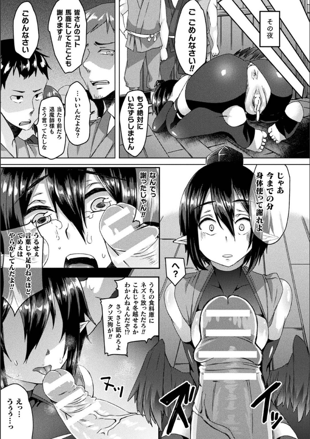 - >イタズラを繰り返す生意気な天狗娘は村長に怒りを買われて退魔師に淫紋をつけられる。いままでに被害を受けた男たちに輪姦レイプ調教されて完全肉便器堕ちしてしまう!