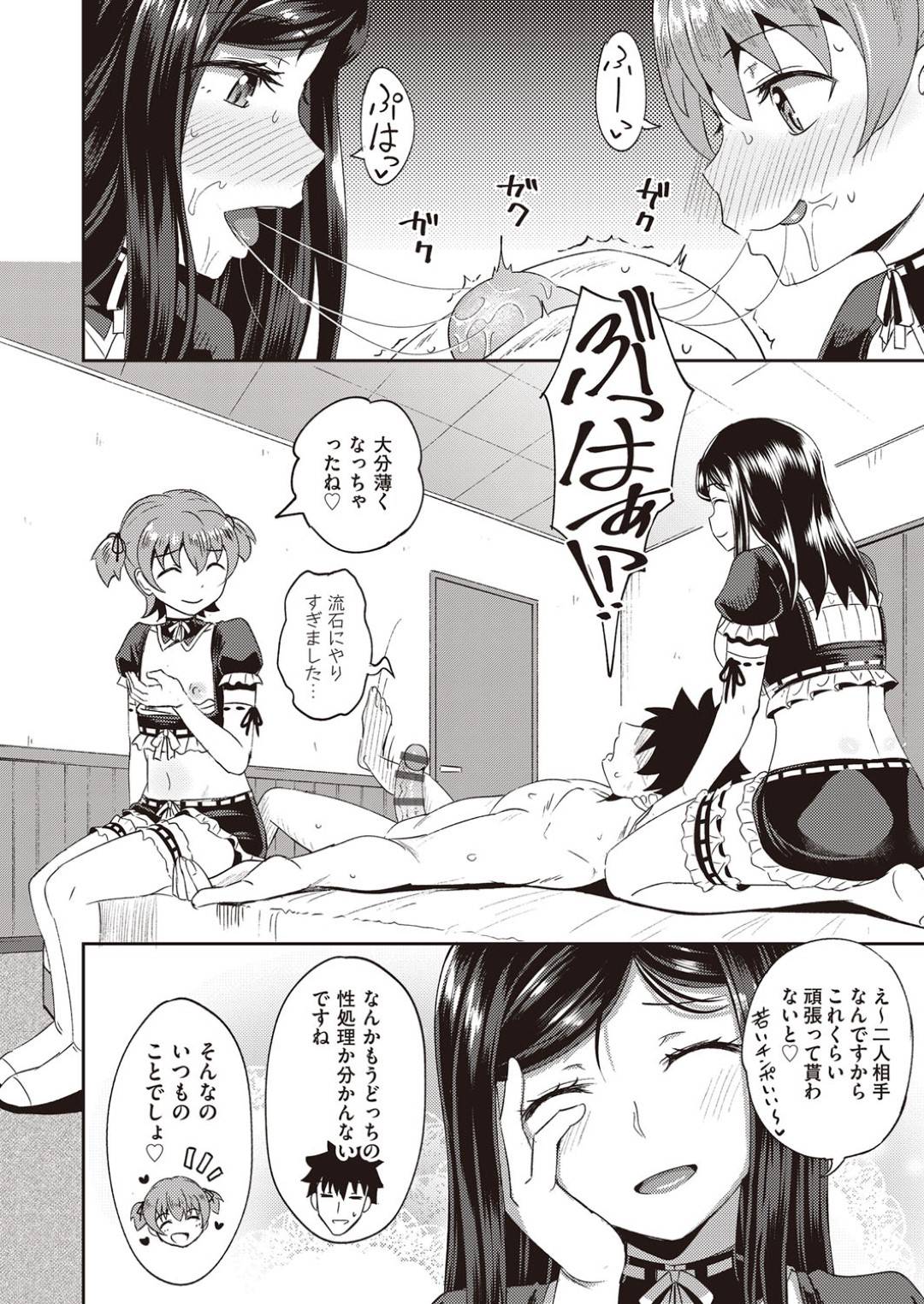 ご主人様の息子の性処理をする黒髪ロングの巨乳美女とちっぱいロリの二人のメイド…二人で責めまくって生ハメ中出しセックスでイカセまくる!