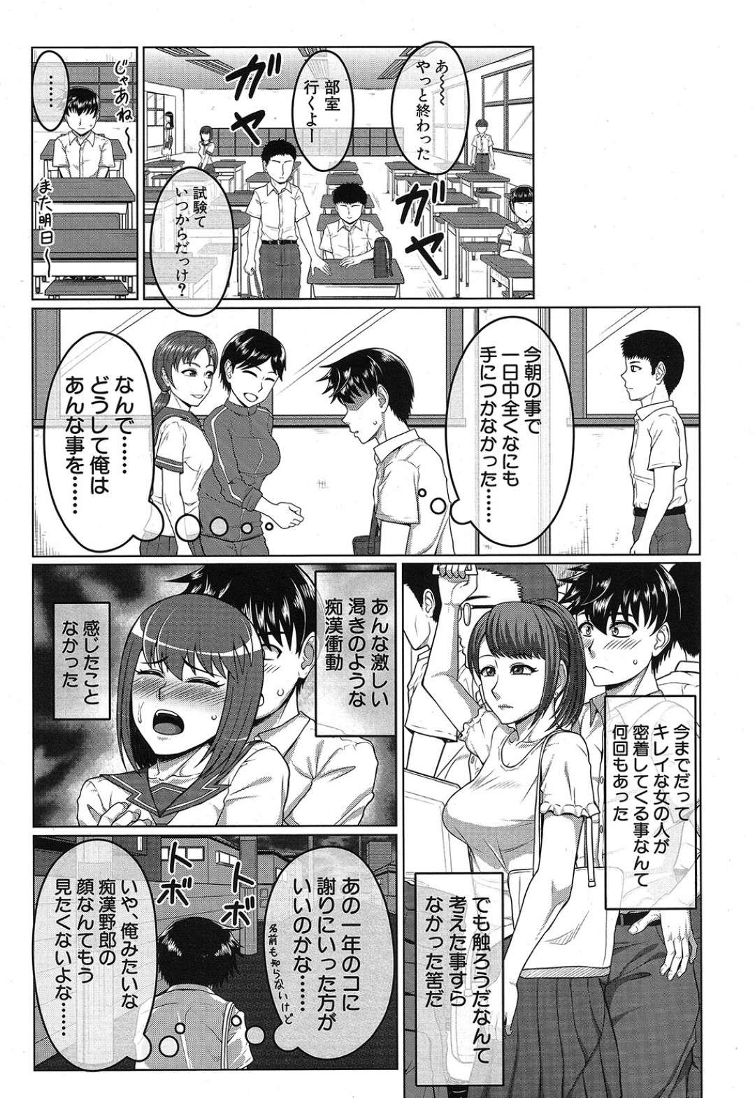 【エロ漫画】清楚系ビッチな同級生に空き教室へと呼び出された主人公。彼が巨根と噂を聞いた彼女は彼のチンポに興味津々のようで、半強引に手コキで射精させた後、騎乗位で童貞を奪う。