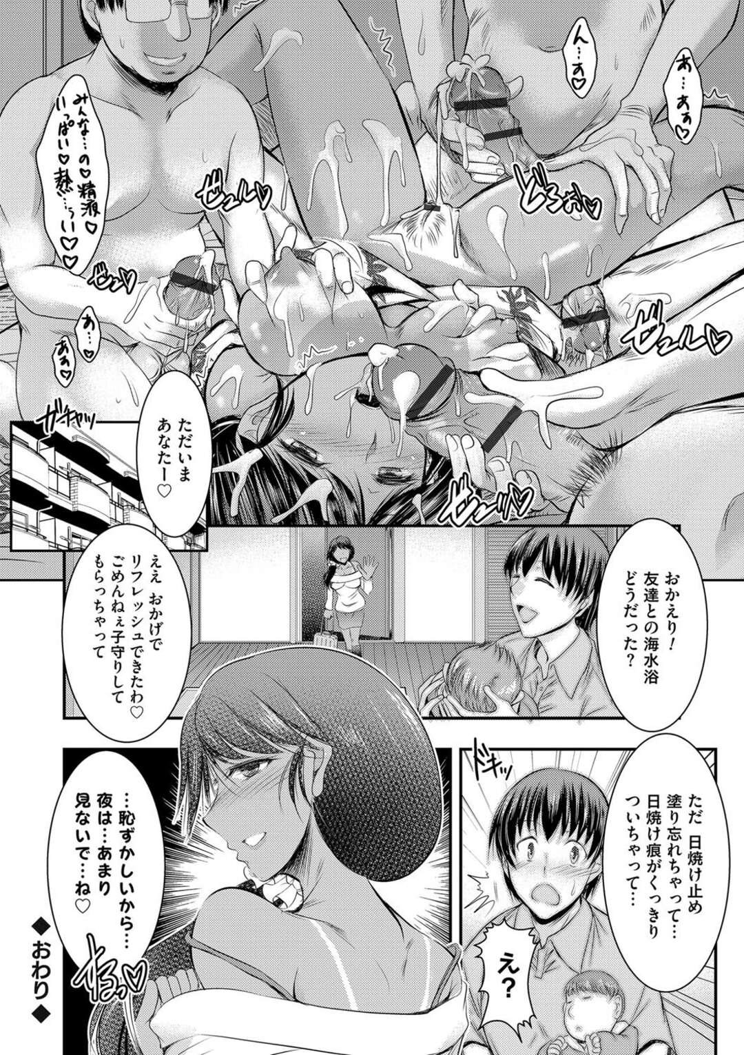 - >旦那と子供そっちのけでセフレ達と海水浴旅行に来た堕ち人妻…昼も夜も4Pでハメハメして中出しパラダイス。