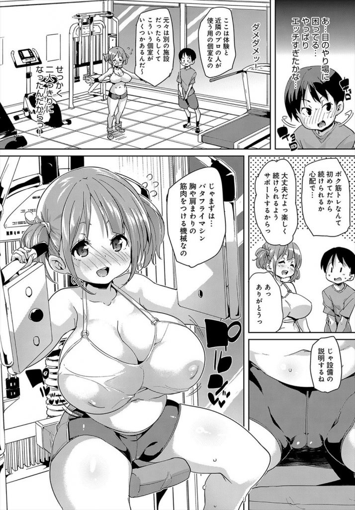 【エロ漫画】ひ弱男子をジムに誘い薄手のトレーニングウェアでムチムチ爆乳ボディを見せつけ筋トレSEXするJK!