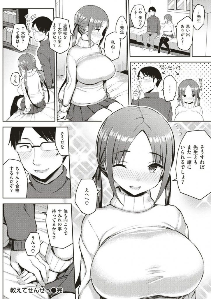 たわわな乳尻を眺めて目のやり場に困りながら教え子のJKに勉強を教える家庭教師の男が辞める事になり逆告白されると最後の思い出にと爆乳後ろから揉みしだき乳首をコリコリ摘まんでいると乳アクメする敏感ボディに感動しながら愛撫して大きなおっぱいでパイズリしてもらい処女マンに突っ込むと膣圧に腰が止まらなくなりデカ尻にぶっかけ射精!
