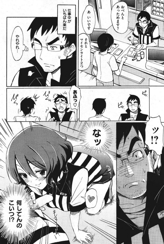 - >【エロ漫画】コンビニ店長の男が魔性の女と噂されるバイト女子に色仕掛けされレジカウンター下でフェラチオ顔射!