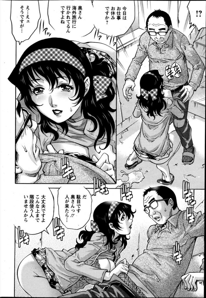 【エロ漫画】マンションの階段で放尿してる人妻を見たおじさんが勃起乳首で亀頭を擦られ濃厚フェラから屋外生挿入!
