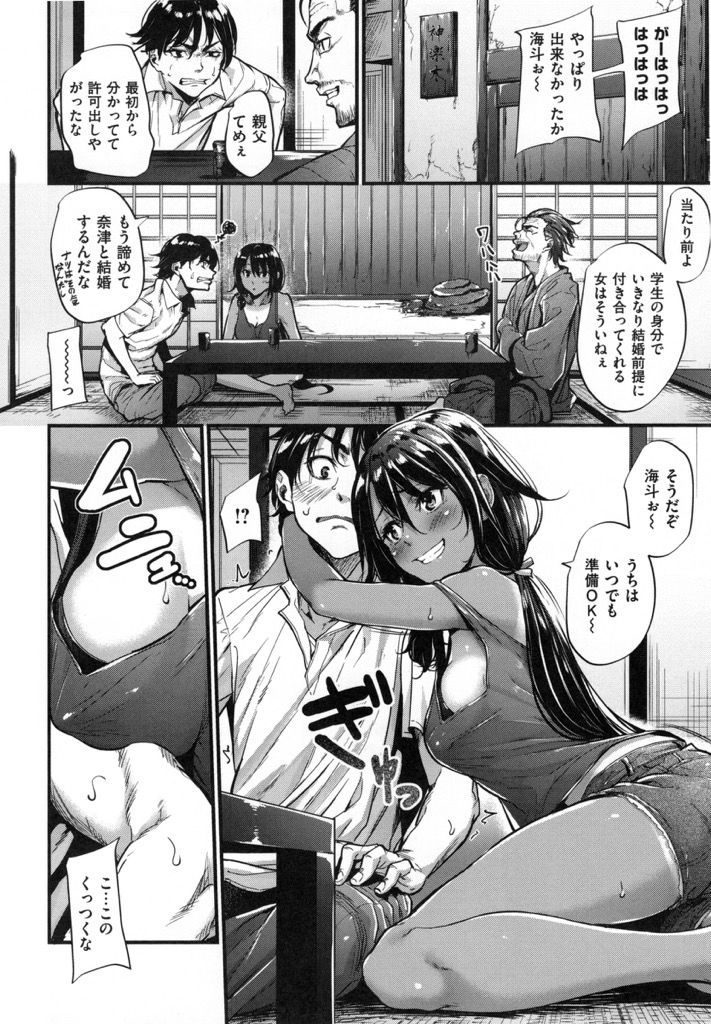 - >【エロ漫画】親が決めた幼馴染の男勝りな許嫁に反発する男だが逆夜這いされ日焼け跡ボディに興奮すると初セックス!