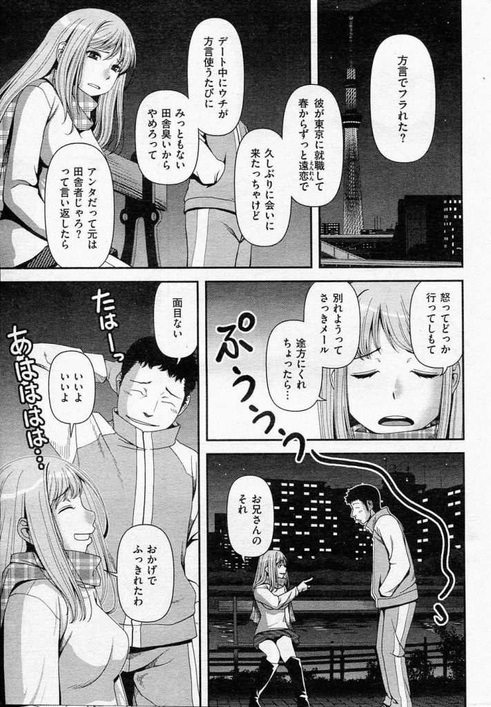 - >【エロ漫画】方言で彼氏にフラれた田舎娘を家に泊めた男が指マンでGスポット責めして潮を吹かせ巨根で子宮ノック!