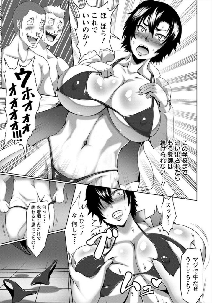 写真をネタに脅迫されマイクロビキニを着せられる女先生だがホルスタイン乳をオナホ代わりに若いペニスを擦りつける生徒達!水に入ると水着が溶けてスケスケになり水中で部員たちにスパルタレイプされザーメンまみれで撮影される!